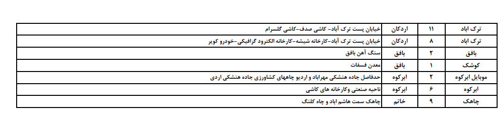 به گزارش خبرگز اری صدا وسیما مرکزیزد, در اطلاعیه  شرکت توزیع برق با اعلام قطعی برق دوساعته در مناطق مختلف استان آمده است: