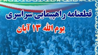 در پایان این مراسم قطعنامه 6 بندی راهپیمایی قرائت شد که در آن به اعتماد به جوانان برای حل مشکلات داخلی، هشیاری در برابر توطئه دشمنان در نا آرام کردن کشورهای عراق و لبنان به عنوان محورهای مقاومت، اطاعت از ولایت فقیه به عنوان رمز عبور از این پیچ تاریخی و با غلبه بر مشکلات داخلی و خارجی و استفاده از اسناد لانه جاسوسی در کتاب های درسی برای آشنا کردن نسل جوان با دشمنی های استکبار با انقلاب اسلامی تاکید شده است.