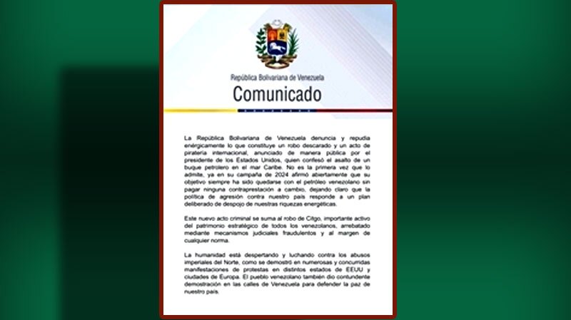دولت ونزوئلا با انتشار بیانیه‌ای تند، توقیف غیرقانونی نفتکش متعلق به این کشور در دریای کارائیب توسط ایالات متحده را محکوم کرد و آن را مصداق بارز «دزدی دریایی» و «غارت سازمان‌یافته» منابع انرژی خود دانست.